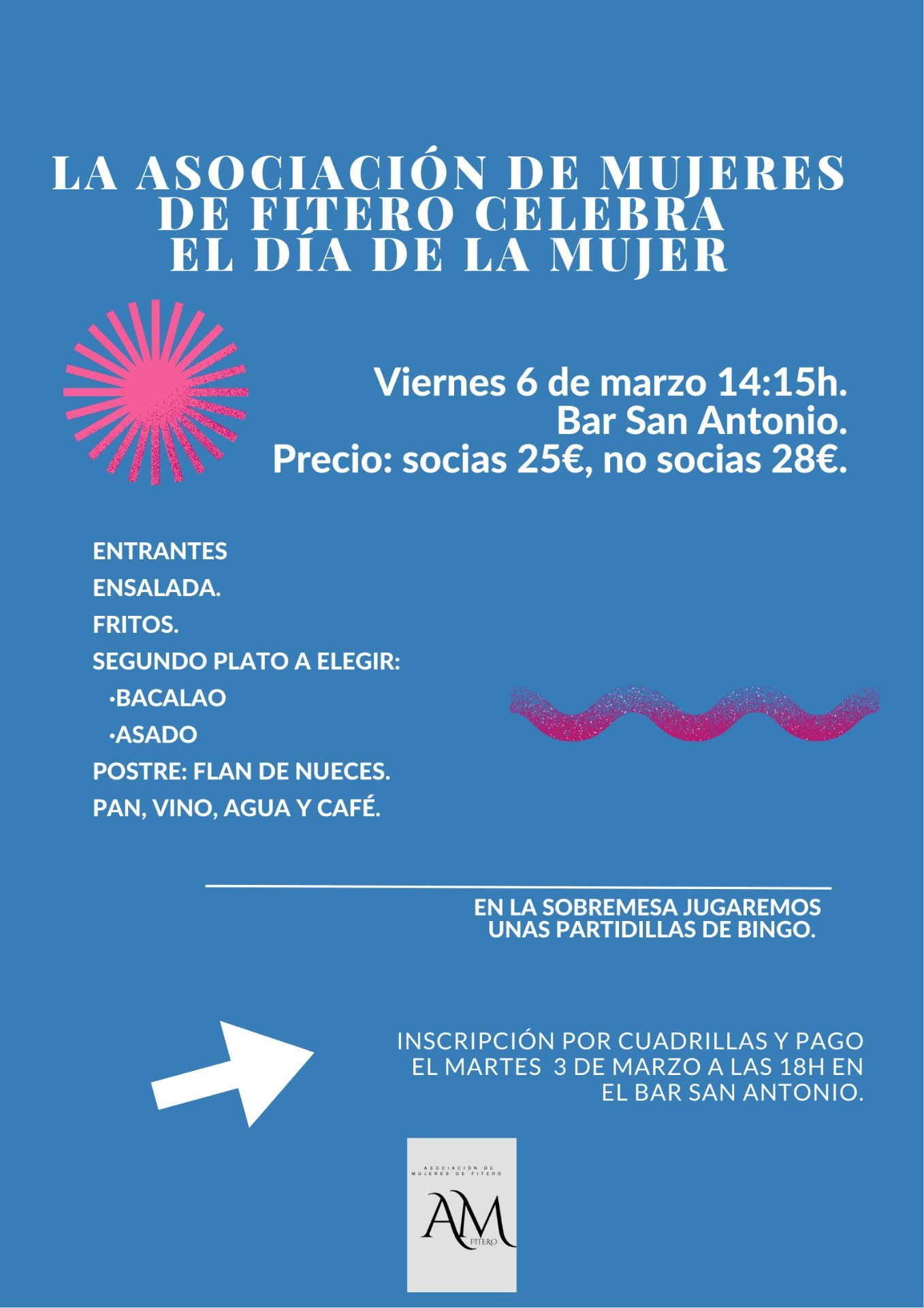 Comida para socios de la Asociación de Jubilados con menú incluido y bingo al finalizar.