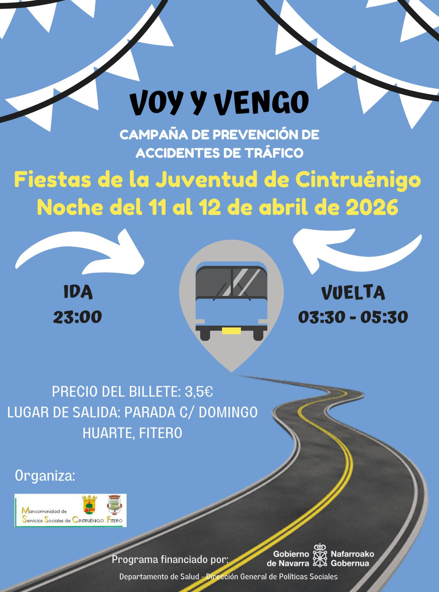 Servicio de transporte especial para jóvenes durante las Fiestas de la Juventud de Cintruénigo. Noche sábado 11 y domingo 12 de abril. Más información en cartel adjunto.