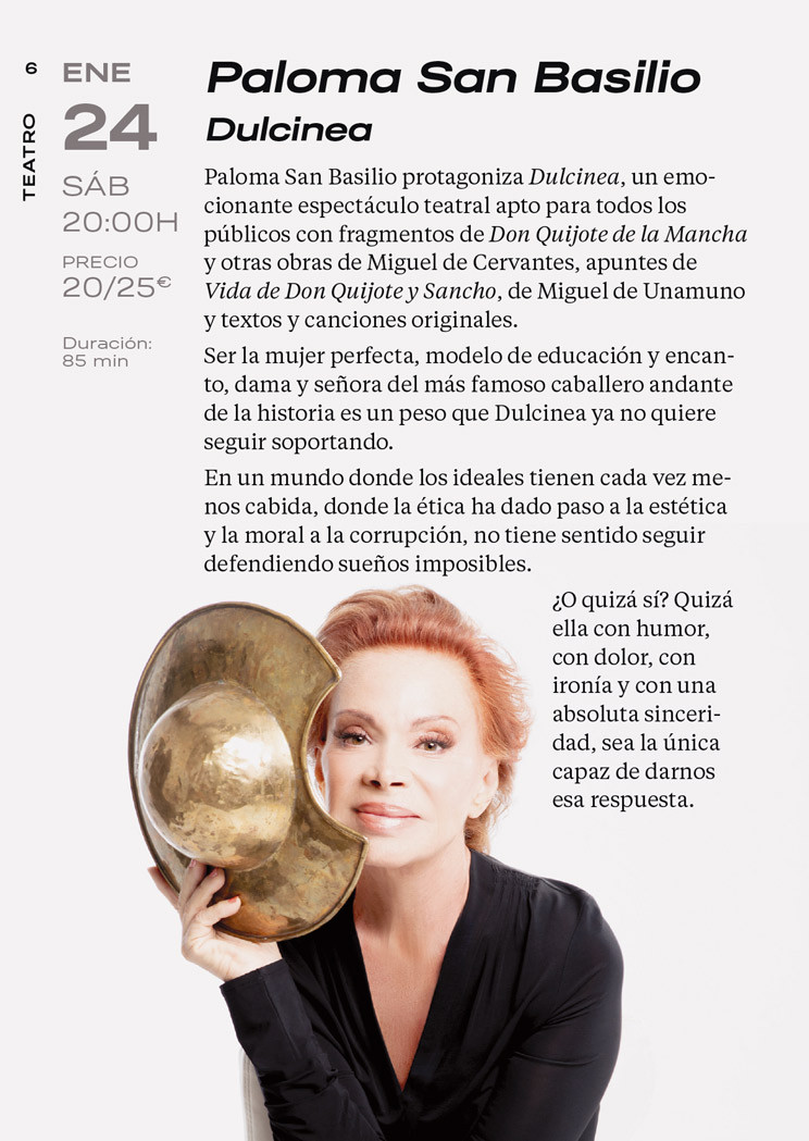 Paloma San Basilio protagoniza “Dulcinea”, un emocionante espectáculo teatral apto para todos los públicos con fragmentos de Don Quijote de la Mancha y otras obras de Miguel de Cervantes, apuntes de Vida de Don Quijote y Sancho, de Miguel de Unamuno y textos y canciones originales.