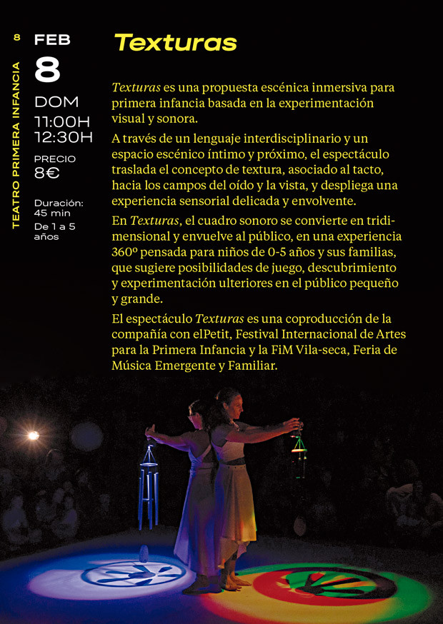 El espectáculo Texturas es una coproducción de la compañía con elPetit, Festival Internacional de Artes para la Primera Infancia y la FiM Vila-seca, Feria de Música Emergente y Familiar.