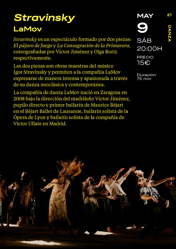 Stravinsky es un espectáculo formado por dos piezas: El pájaro de fuego y La Consagración de la Primavera. Dos obras maestras de Stravinsky que permiten a LaMov expresarse de manera intensa y apasionada a través de su danza neoclásica y contemporánea. La compañía explora, bajo la dirección de Víctor Jiménez, los movimientos fluidos y enérgicos, y también etéreos y misteriosos; y refleja la tensión y la vitalidad de la música.
