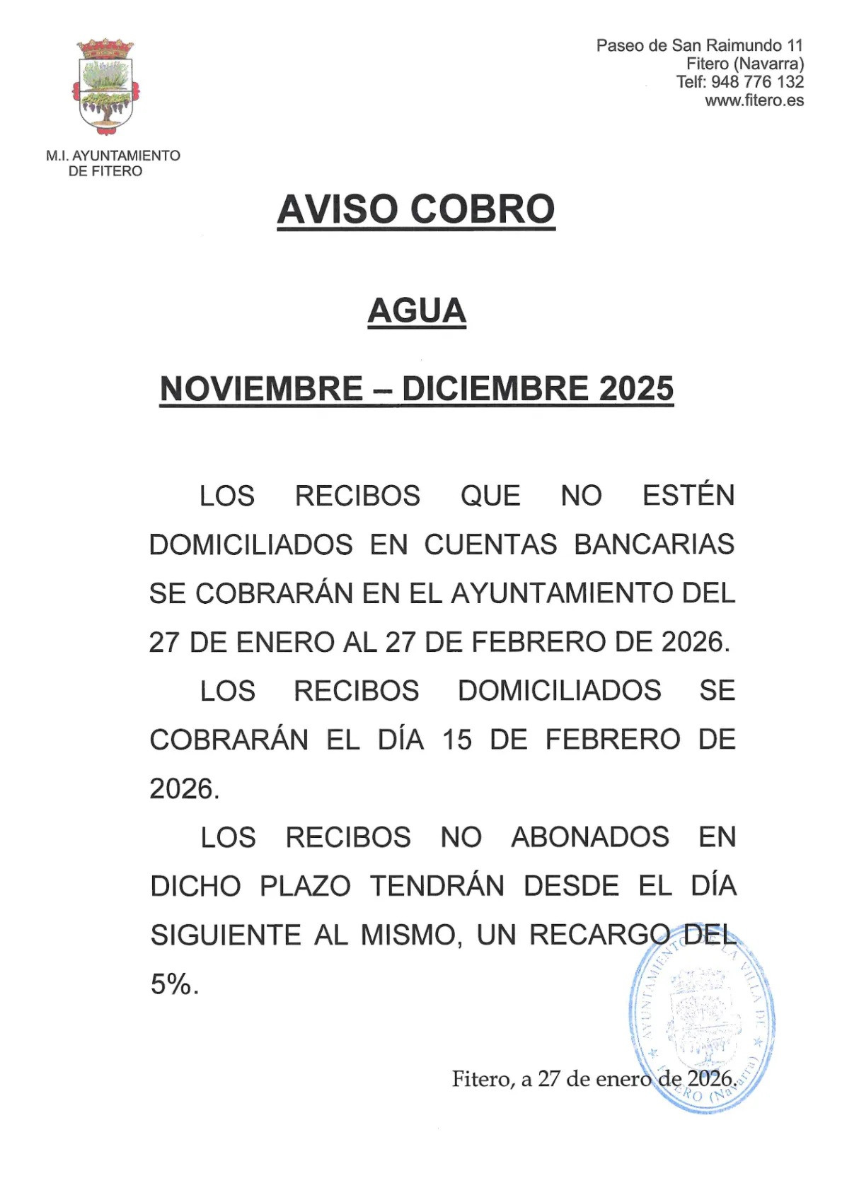Noviembre-Diciembre 2025 Los recibos que no estén domiciliados en cuentas bancarias se cobrarán en el Ayuntamiento, del 27 de enero al 27 de febrero de 2026. Más información en cartel adjunto.