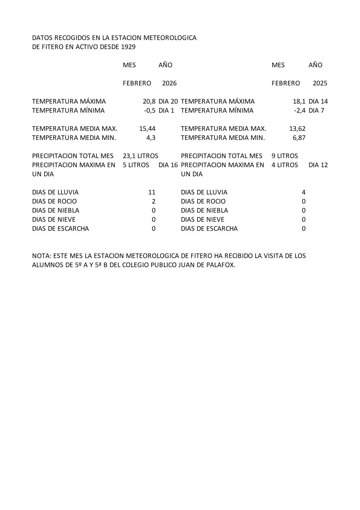 Mes de febrero. En imágenes se puede ver la visita de escolares que tuvo la estación meteorológica de Fitero. Más información en documento adjunto.