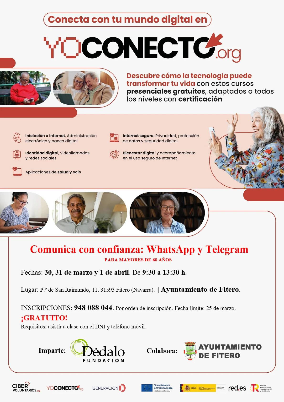 El uso de WhatsApp y Telegram. Horario: 9:30 a 13:30 h. Inscripciones abiertas hasta el 25 de marzo. Teléfono de inscripciones: 948 088 044 Por orden de inscripción. Más información en cartel adjunto.