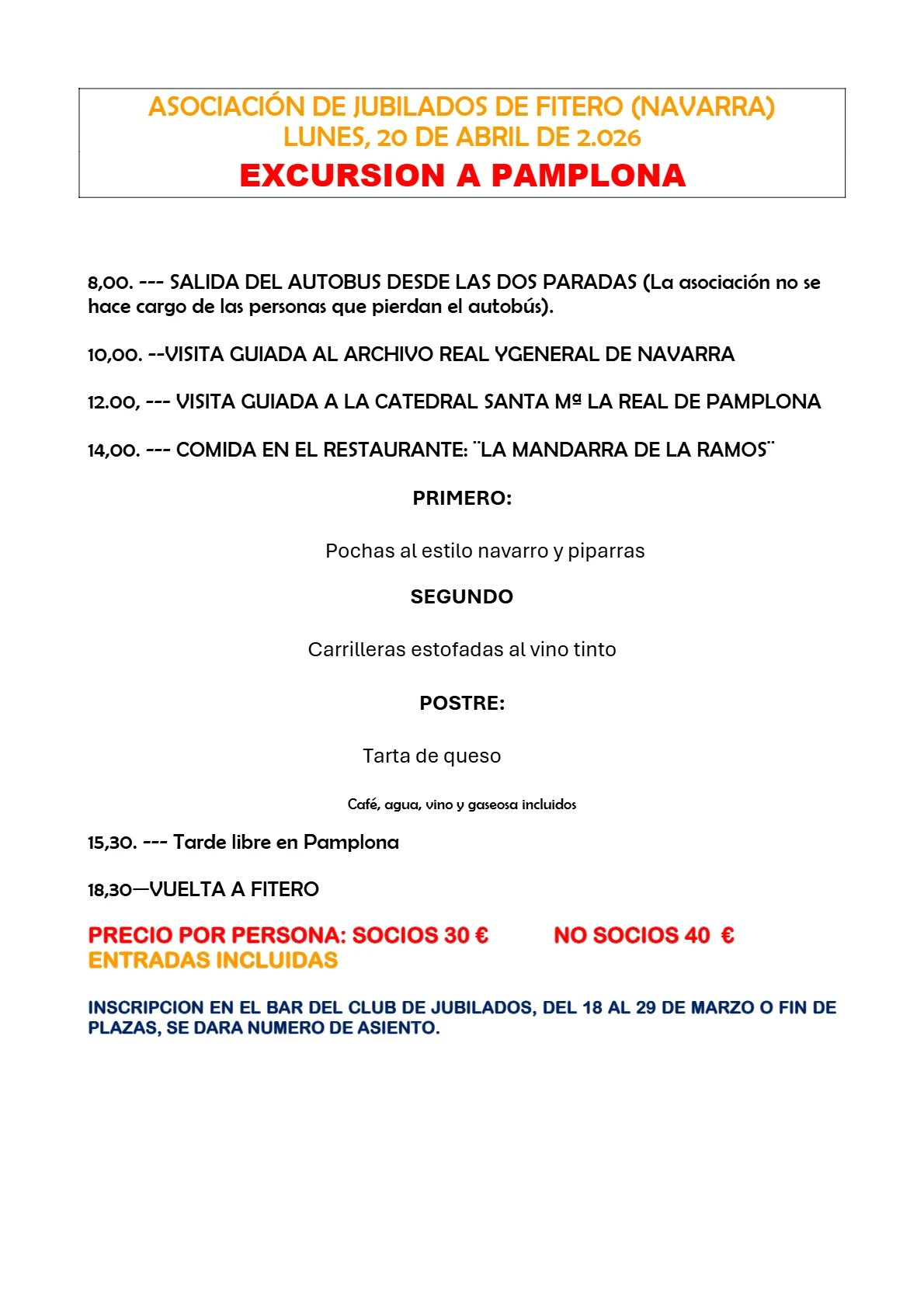 Excursión organizada para jubilados de Fitero con visitas guiadas al Archivo Real y General de Navarra y a la Catedral Santa María la Real de Pamplona, comida incluida y tarde libre.